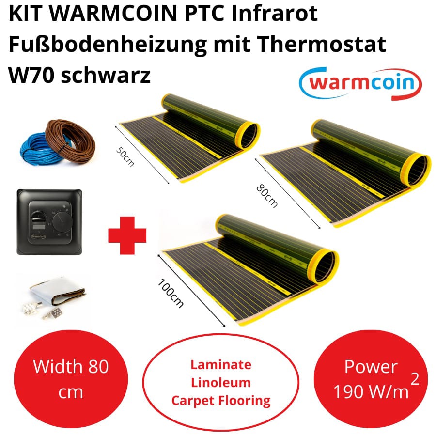 Infrarot-Heizfolie Warmcoin PTC 190W/m² + Installationskit + W70 Thermostat Schwarz
