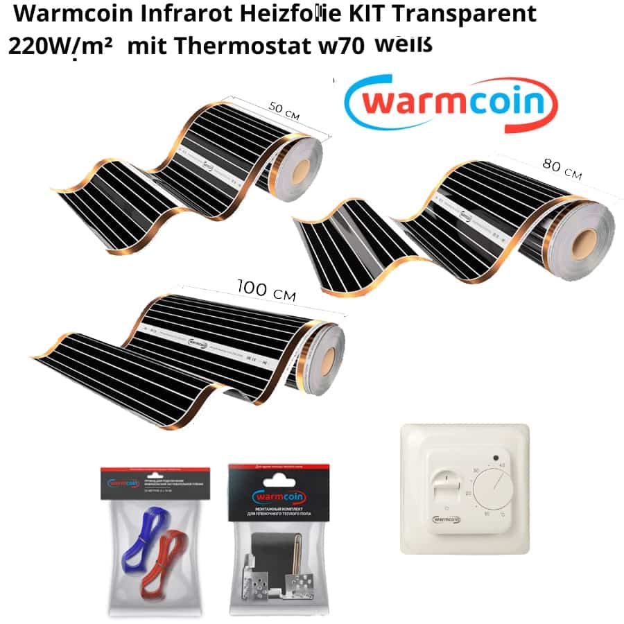 Infrarot-Heizfolie Warmcoin Transparent 220W/m² + Montagesatz + W70 Thermostat Weiß