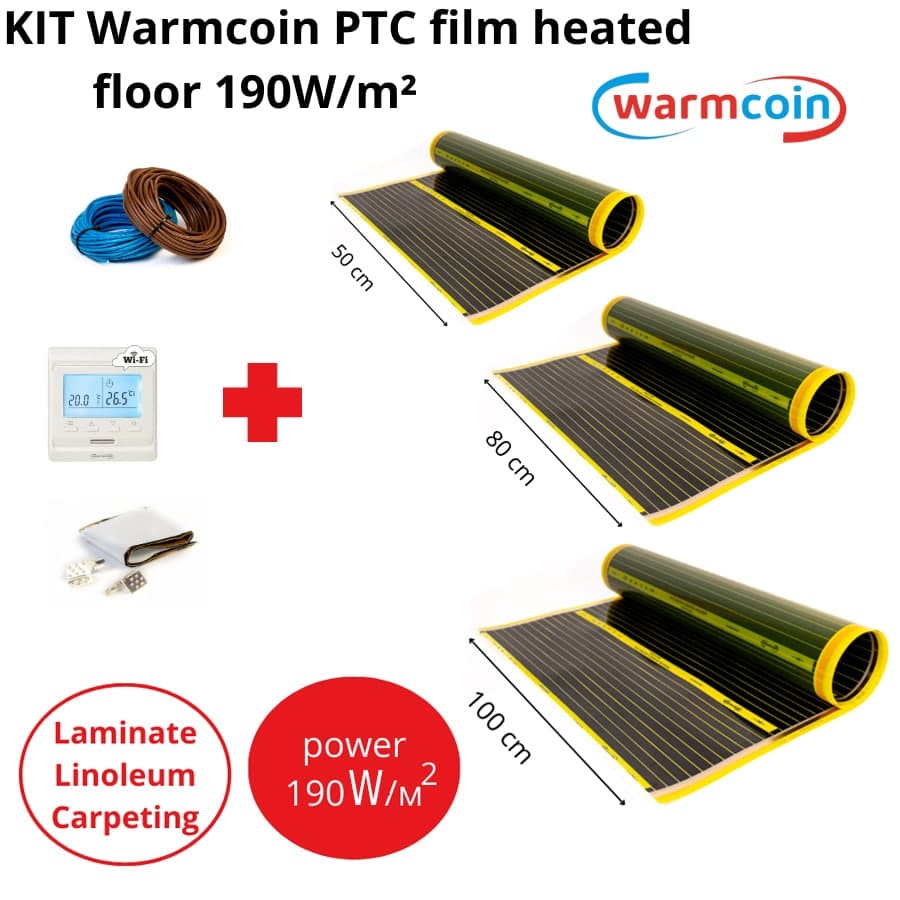 Infrared Heating Film Warmcoin PTC 190W/m², Installation Kit and W51 Wifi Thermostat White, featuring high-coverage carbon infrared film (98%). Incorporates advanced technology and is easy to install at an affordable cost. Available widths: 50cm, 80cm and 100cm.