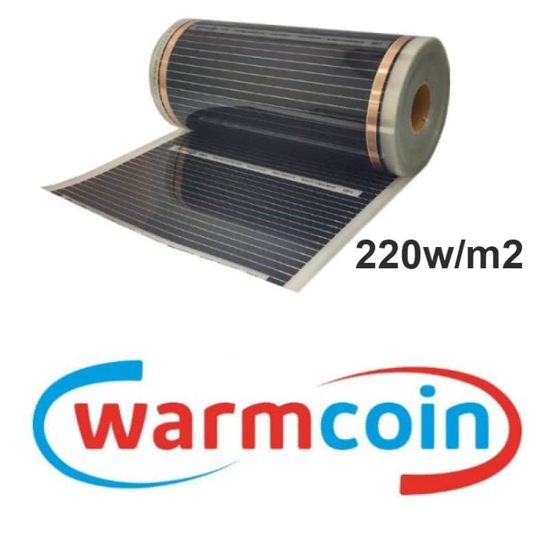 Warmcoin film heated floor, South Korea 220W/m² with a high carbon coverage infrared sheet (98%). Advanced technology and easy installation at an affordable cost. Available in various widths to fit any space, 50, 80, and 100 cm. Sold by meters.