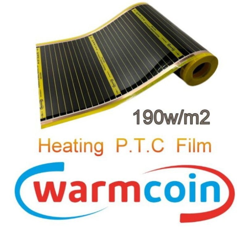 Warmcoin PTC film heated floor 190W/m², with a high carbon coverage infrared sheet (98%). Advanced technology and easy installation at an affordable cost. Available in various widths to fit any space, with rolls of 50, 80, and 100 cm. Sold by meters.